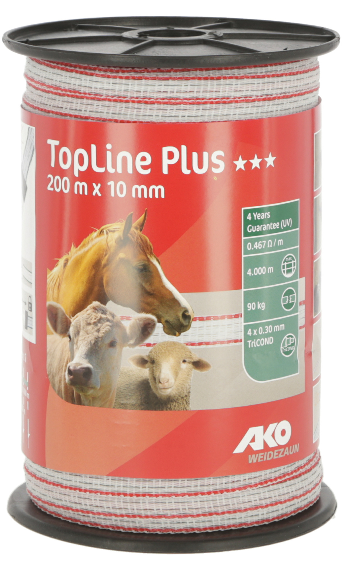 AKO Topline Plus villanypásztor szalag. Hossz: 200 m Szélesség: 10 mm Rozsdamentes acél szál: 4 x 0,30 mm Ellenállás: 0,467 Ohm Szakítószilárdság: 90 kg