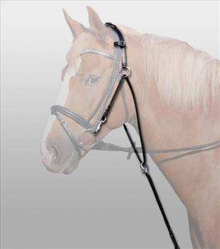 -A tarkórészt helyezze fel a kantárra (mely már a lovon van) és erősítse hozzá a pántok segítségével. A tarkórész két végén található karikákon fűzze át a chambon szárát, majd a húzókarabíner segítségével csatolja a zablához azokat, majd a chambon végét rögzítse a hevederhez, kiképző vagy futószárazó hevederhez.