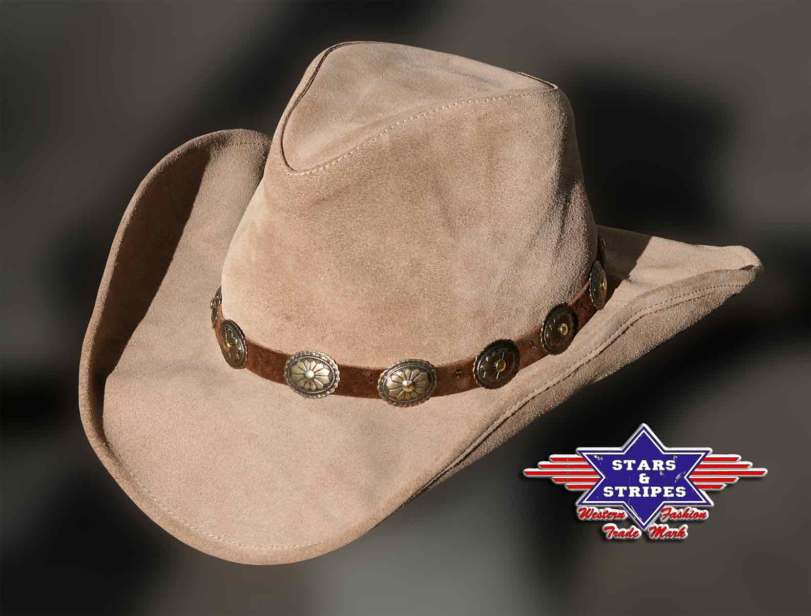 Hasított bőrből készült kalap, fényes bőrpánttal díszítve, melyen fémveretes díszítés van.