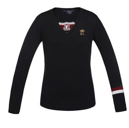 Kötött anyagó karcsúsított pulóver nőknek, V kivágású nyakkal, hátán nagy hímzett logóval.