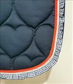 Sötétkék szívecskés steppelésű nyeregalátét, oldalán különböző díszítésekkel.