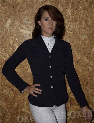 Sötétkék változatában anyagában mintás, szűkített fazonú, cipzárral és patenttal egyaránt ellátott elegáns versenyzakó.