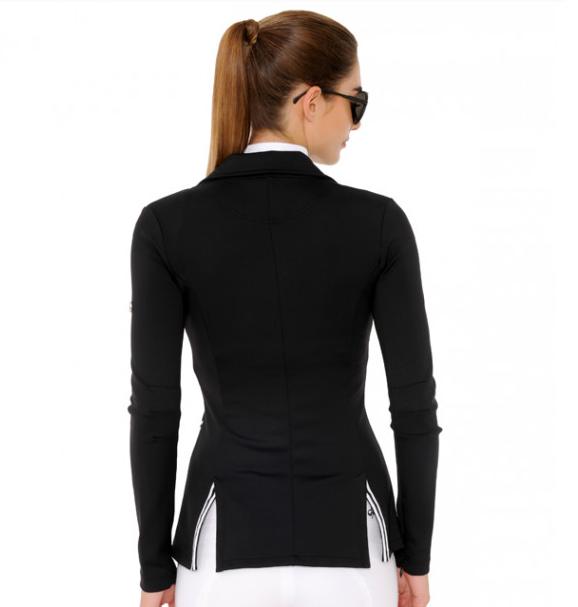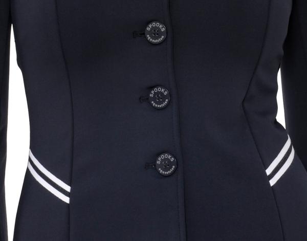 Fekete női Spooks zakó, gallérján kontrasztos fehér csíkokkal.