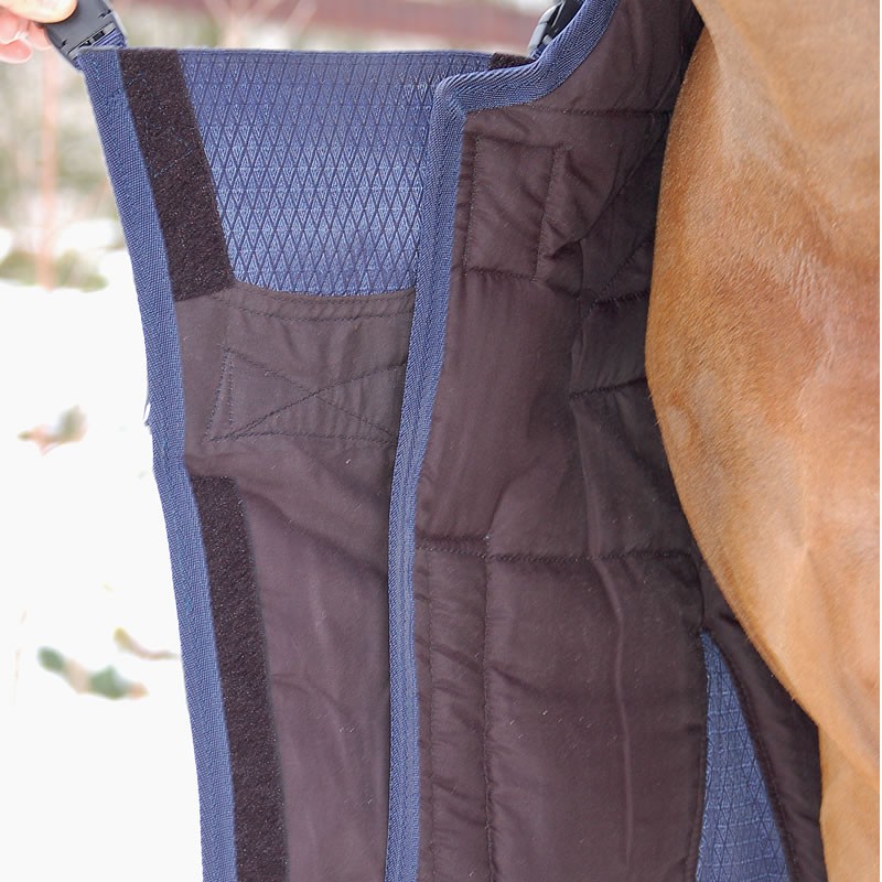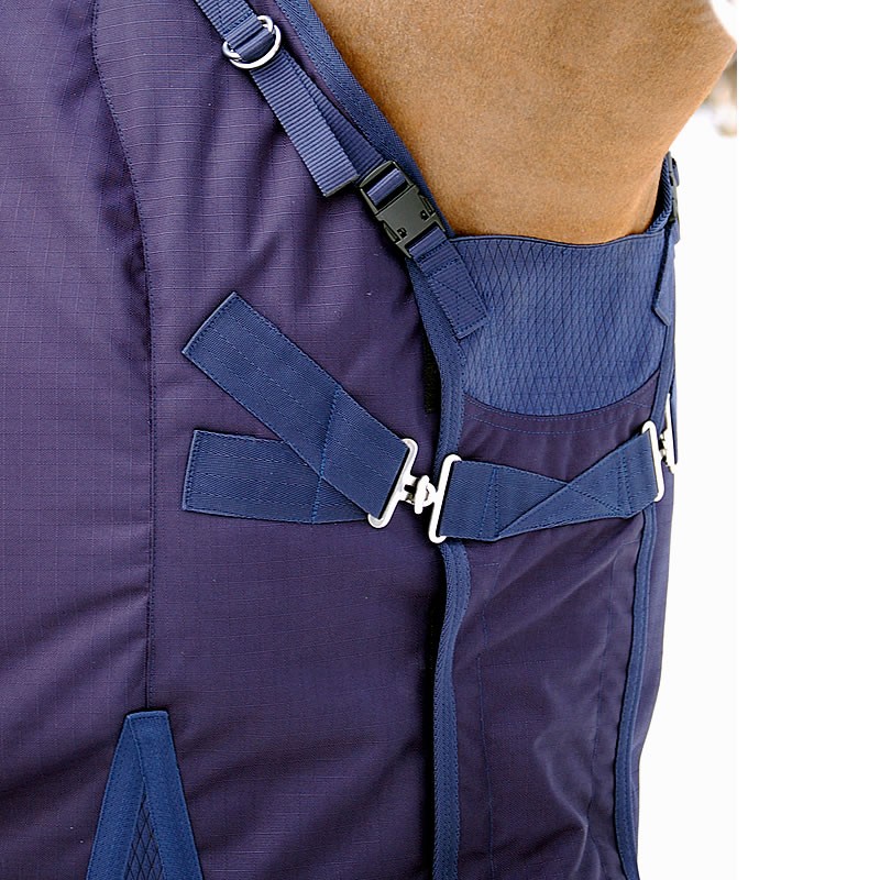 -az elől lévő fém csatjai széles pántokkal rögzítettek, rugalmas betét, és két plusz rögzítő csat segíti azt, hogy a ló mellkasára illeszkedjen, ne mozduljon el a takaró. Így viselete nagy komfortot biztosít.