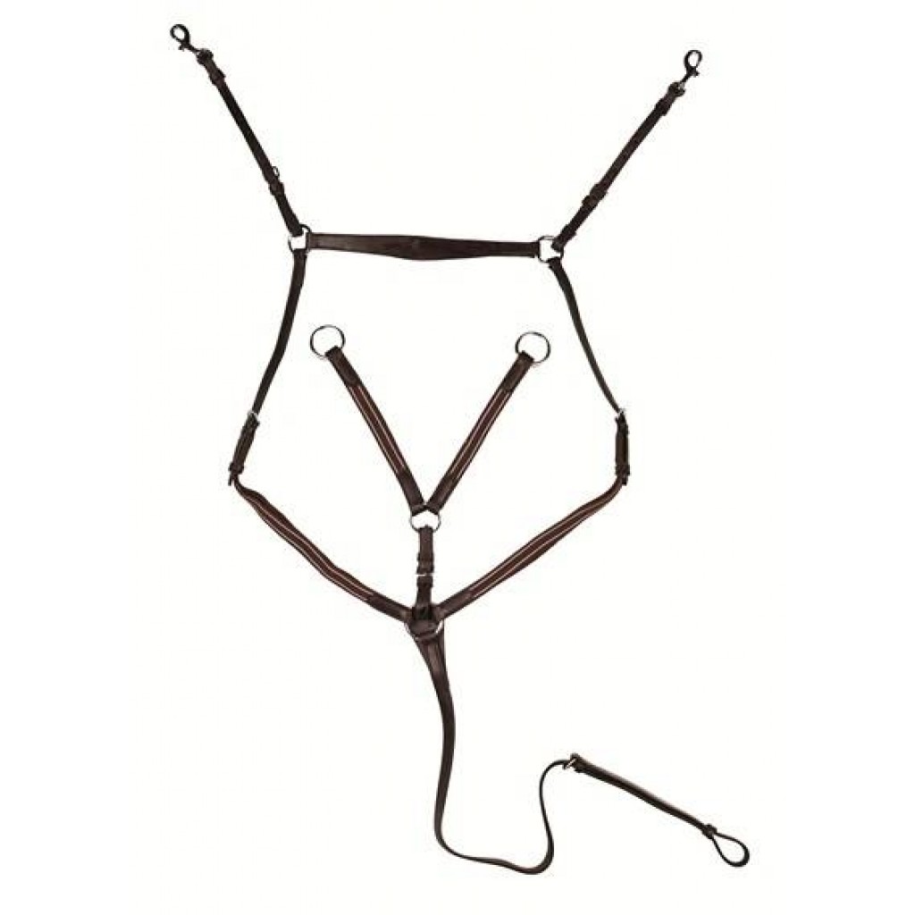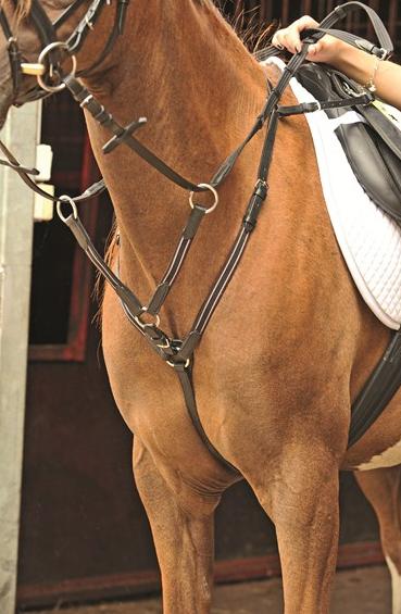 HKM márkájú, kézzel varrott martingál, minőségi bőrből, rugalmas betétekkel, erős, ezüst színű csatokkal.