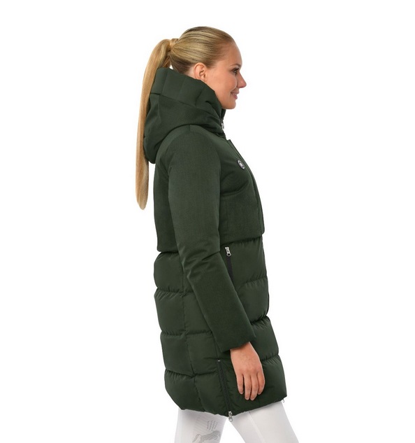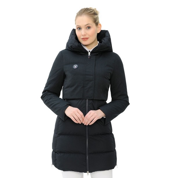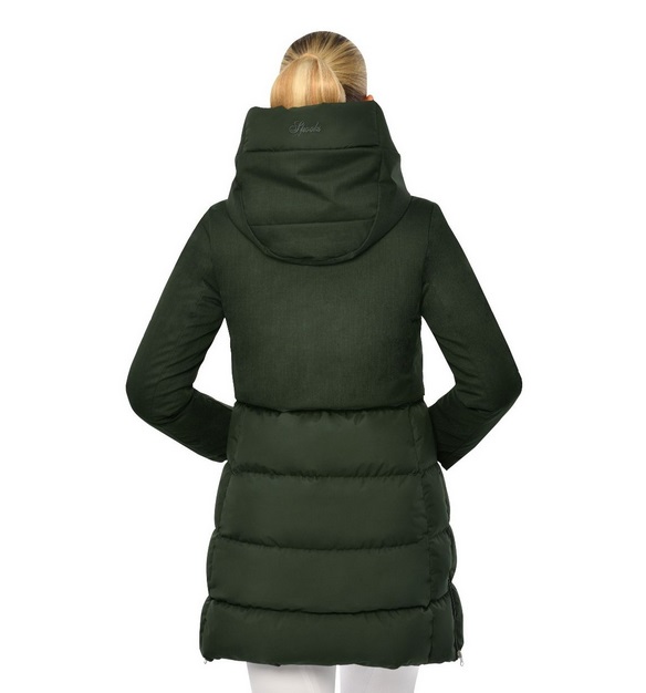 Steppelt női hosszított kabát, felső részén kontrasztos anyaggal.