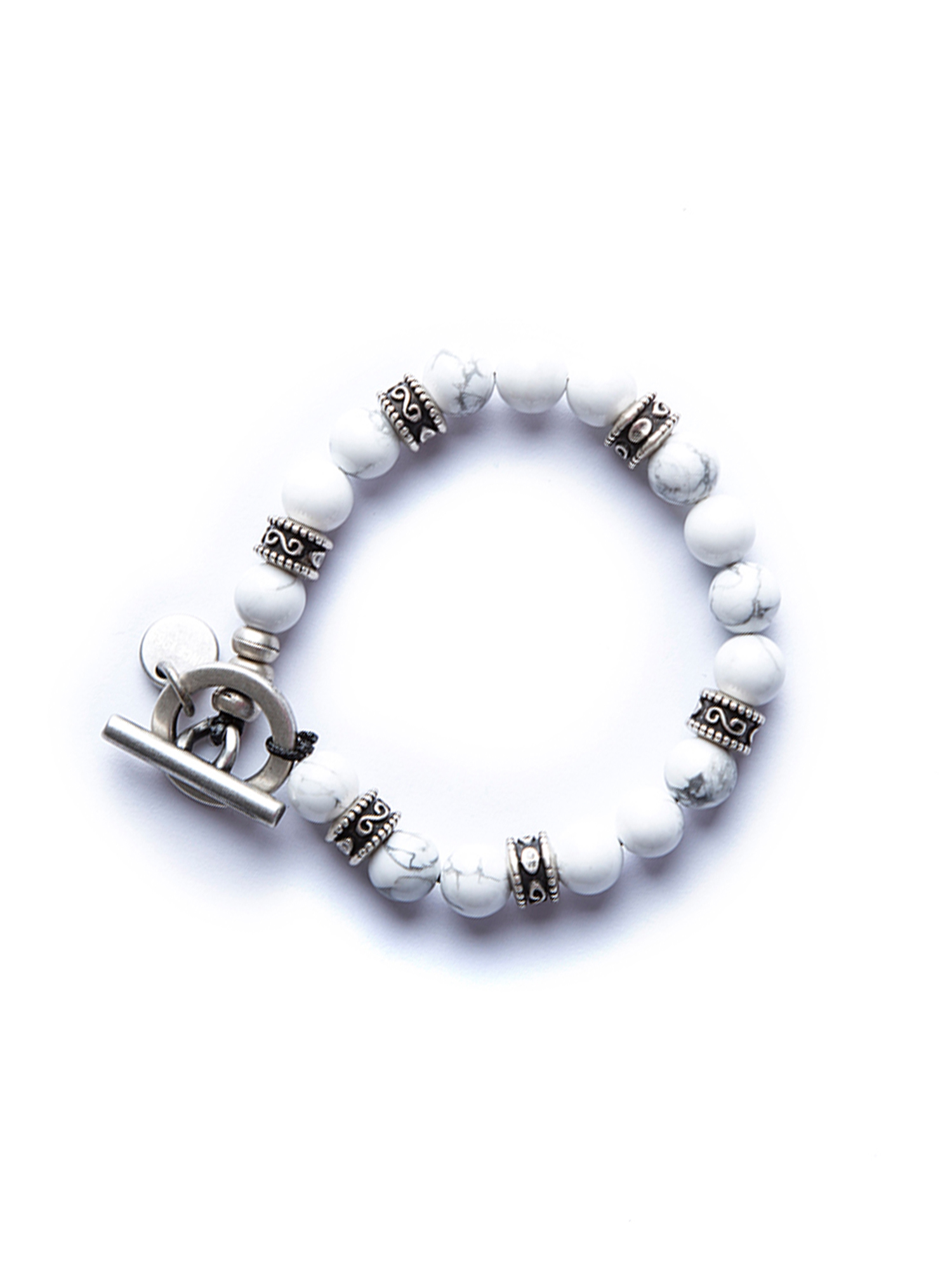 Animo karkötő természetes fehér kövekkel, fém berakásokkal, egyedi megoldású csattal.