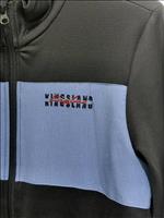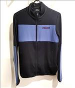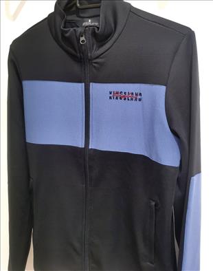 Sötétkék unisex felső, világoskék részletekkel. Cipzáros zsebek.