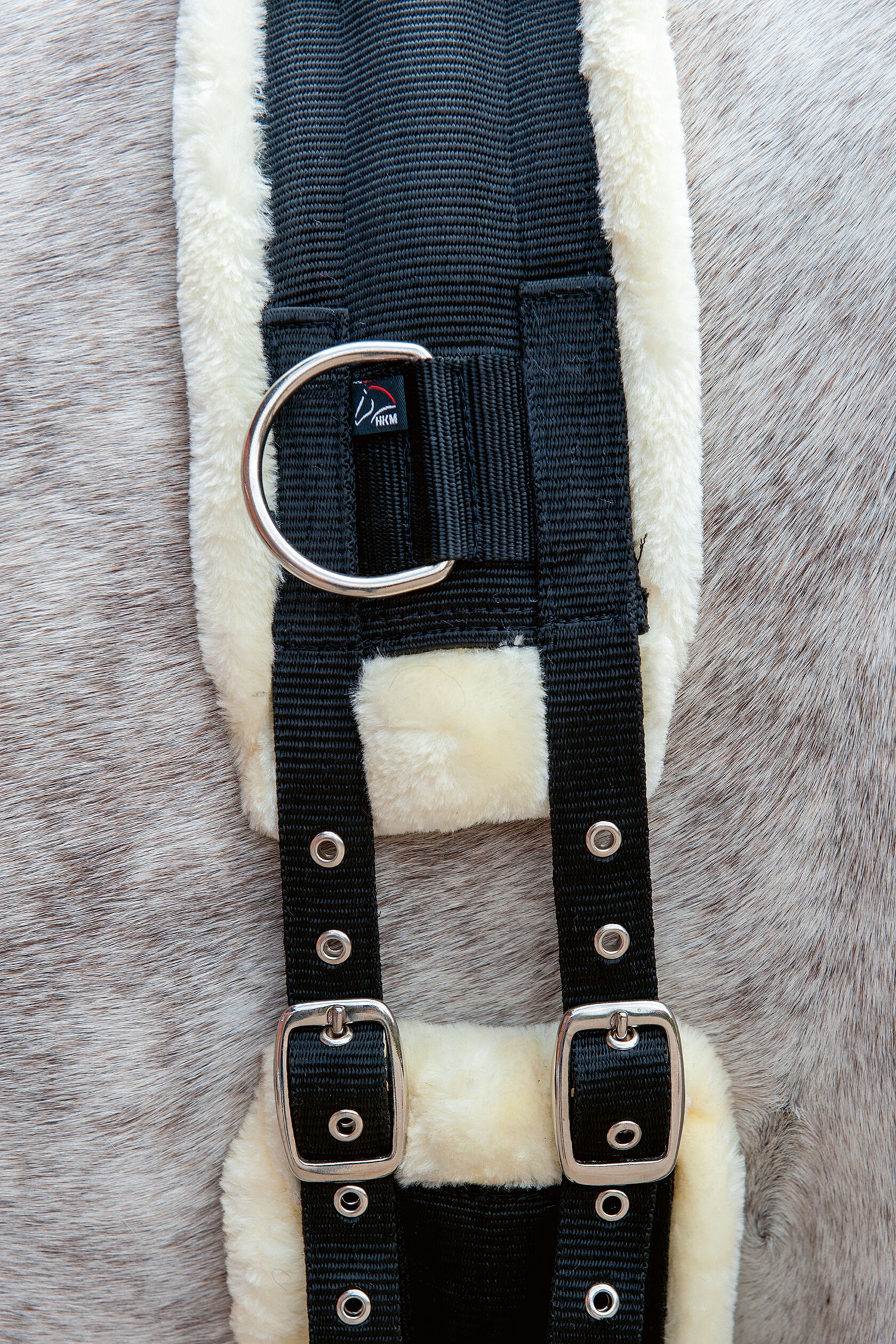Masszív, ezüst színű csatokkal ellátott , teddy polár szőrrel bélelt futószárazó heveder. Anyaga: 100% poliészter