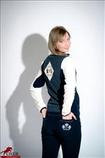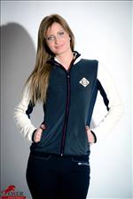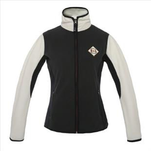 Polár anyagú női felső, kontrasztos színekkel, elején, hátán emblémával.