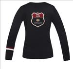 Kötött anyagó karcsúsított pulóver nőknek, V kivágású nyakkal, hátán nagy hímzett logóval.