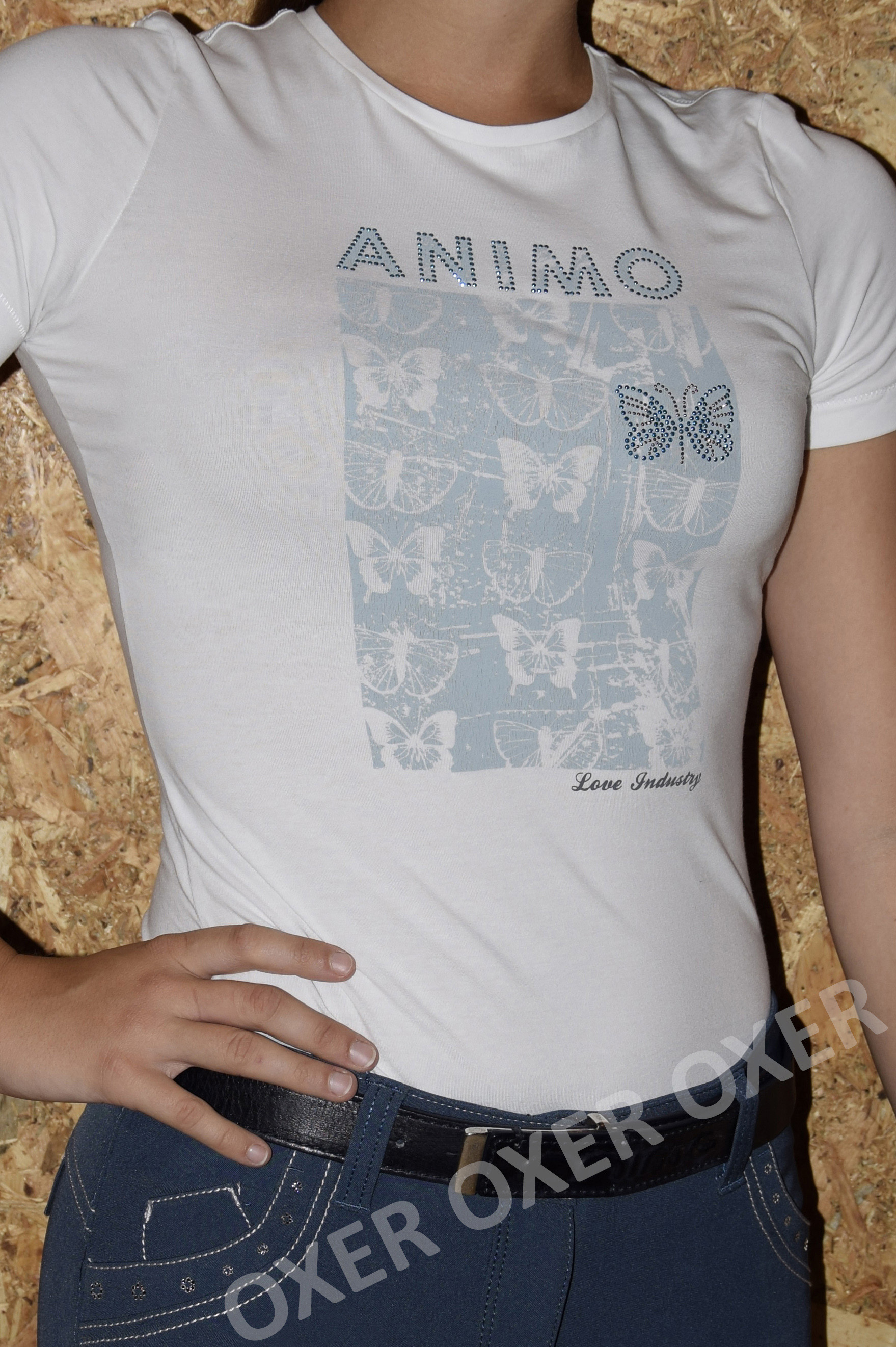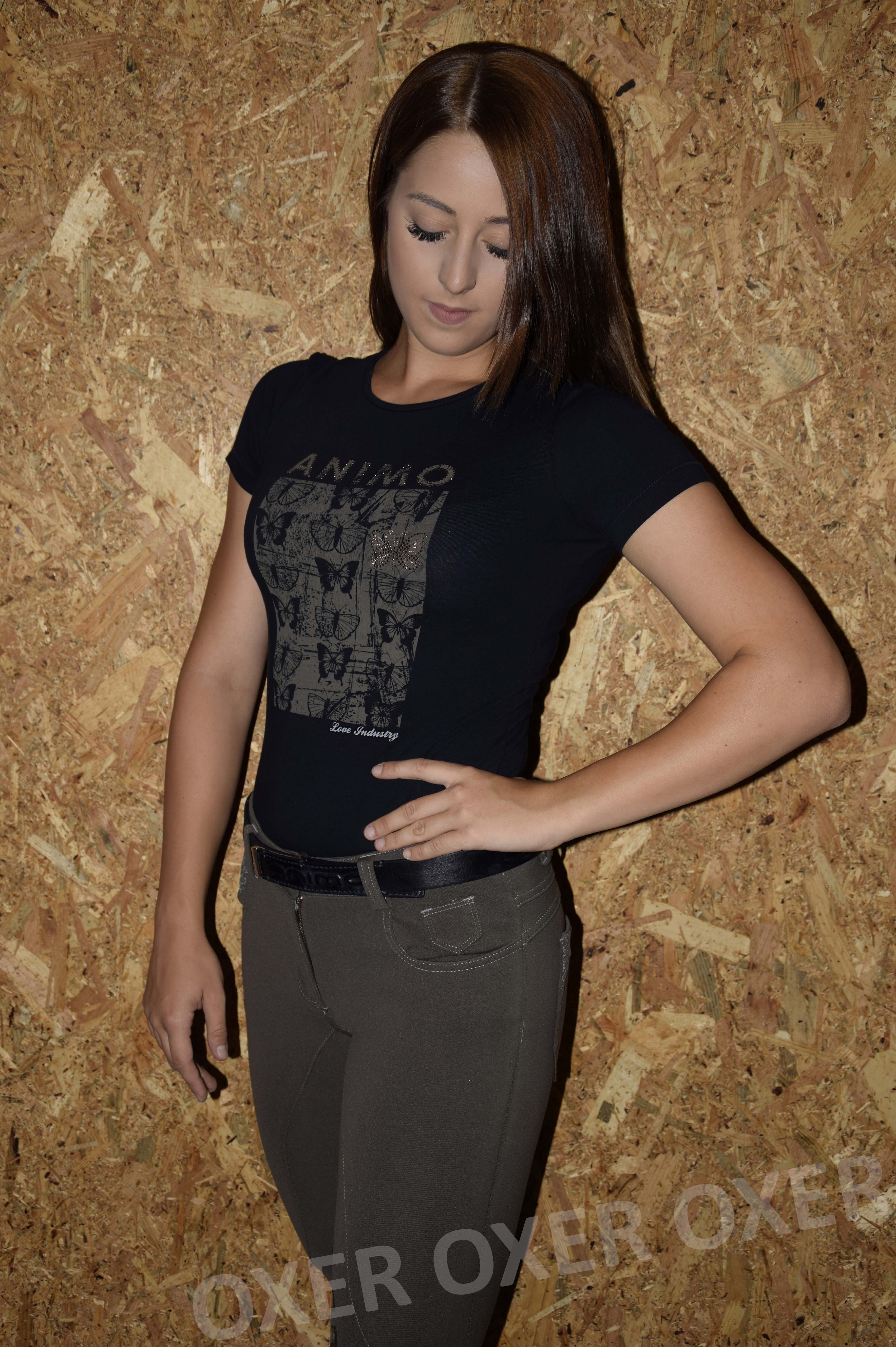 Női pamut póló. Pillangós mintával, Animo logóval, és strasszkővel.